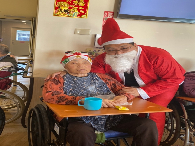 院內副院長扮演聖誕老公公發放糖果餅乾給予住民