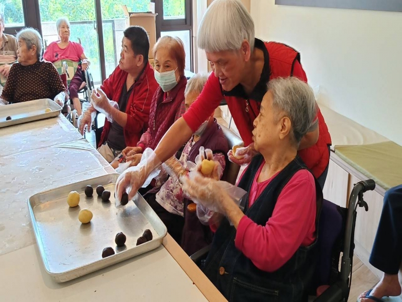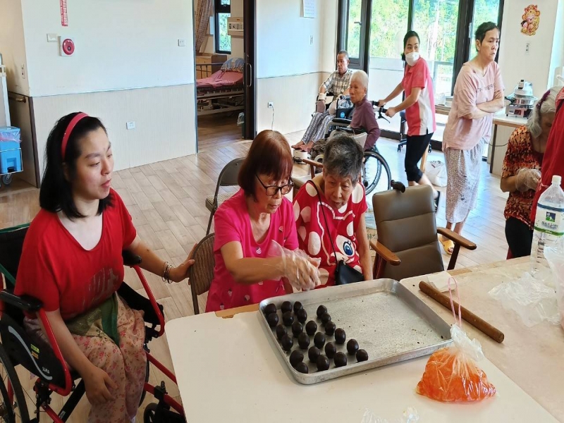今天豫萱的長輩很有過節的氣氛唷!中秋節前夕,謝謝我們的好鄰居吳阿姨親臨機構,現場示範教學超應景的中秋月餅~蛋黃酥,長輩們早早就緒,圍在桌邊,迫不及待的想要親手包下自己的第一顆蛋黃酥,從餡料的製作,酥皮油皮的滾製,到最後餡料與餅皮的結合,每個步驟,長輩都能駕輕就熟,輕輕鬆鬆的完成,看著她們純熟的技巧,我們發現,原來高手在豫萱呀!