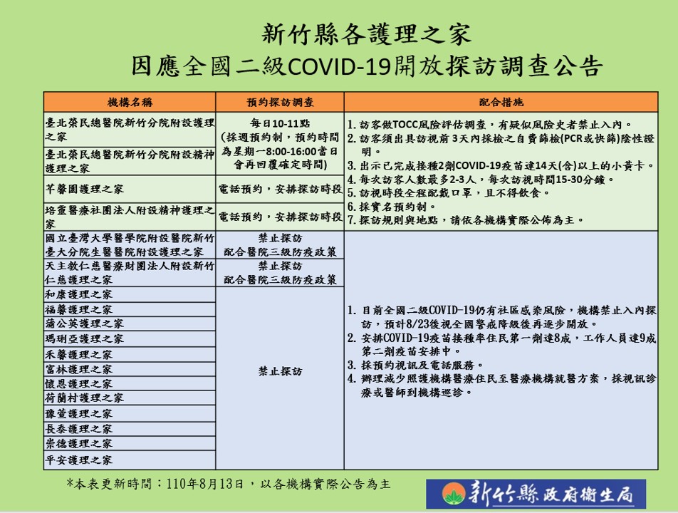 新竹縣各護理之家因應COVID-19全國二級開放公告 ~~本中心仍維持禁止探訪
